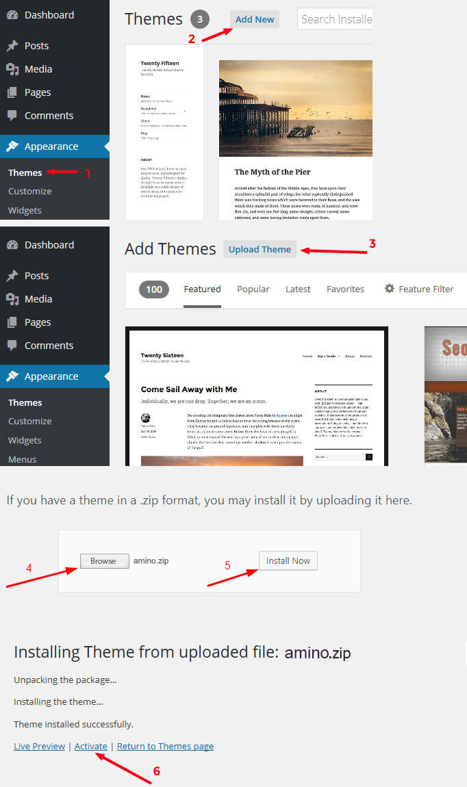 Once installation is complete, your Theme theme will be ready to use. You should now see "amino" appears in the WordPress themes manager panel.