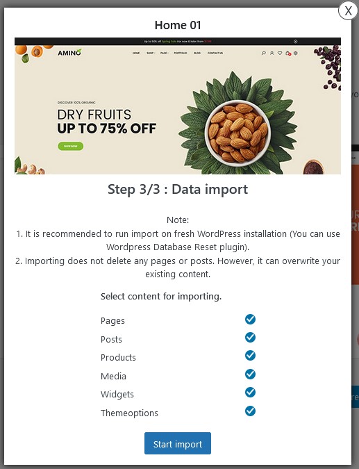 Import Data: Select content for importing >> click Start Import to import demo data.