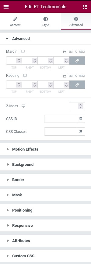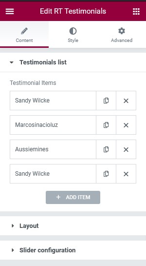 Allows you to add/config testimonials. Click ADD ITEM to add new testimonial.
