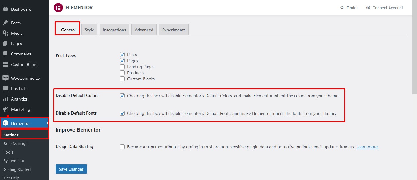 - After importing demo content, Default color and Font of Elementor will be enable. To disable them and make Elementor inherit the colors from your theme, please disable by steps below: