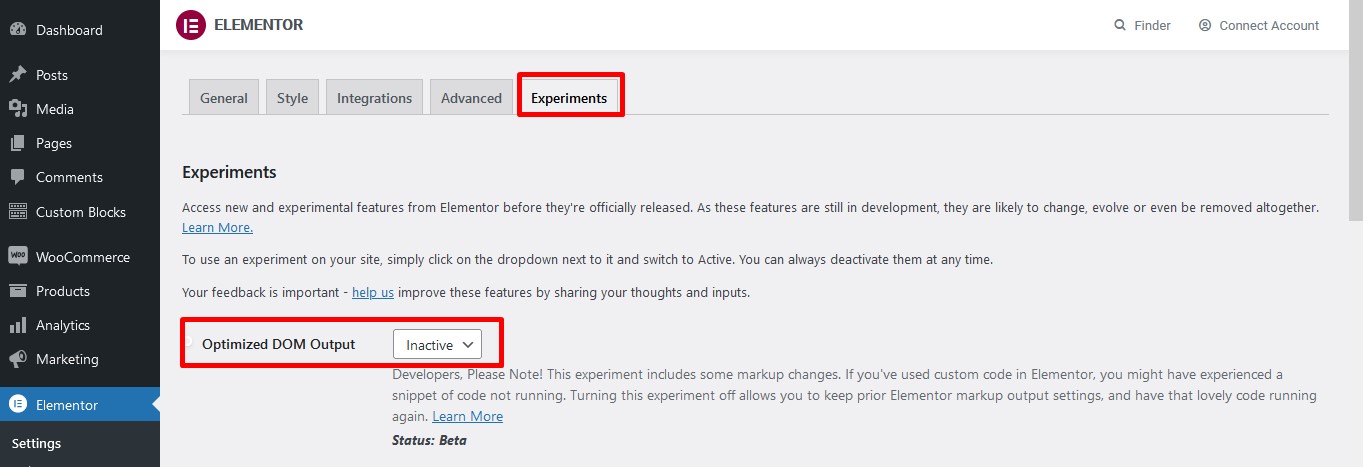 + Next choose tab Experiments >> at Optimized DOM Output: Choose Inactive >> click Save Changes