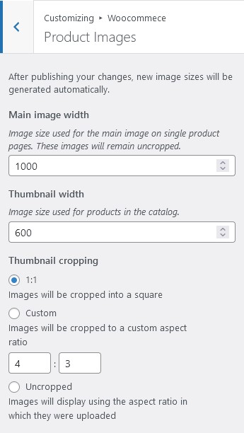 - Go to Dashboard > Appearance > Customize > WooCommerce > Product Images.