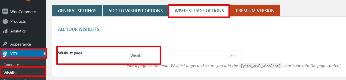 - Setting Wishlist page: Go to Dashboard > YITH > Wishlist > WISHLIST PAGE OPTIONS :